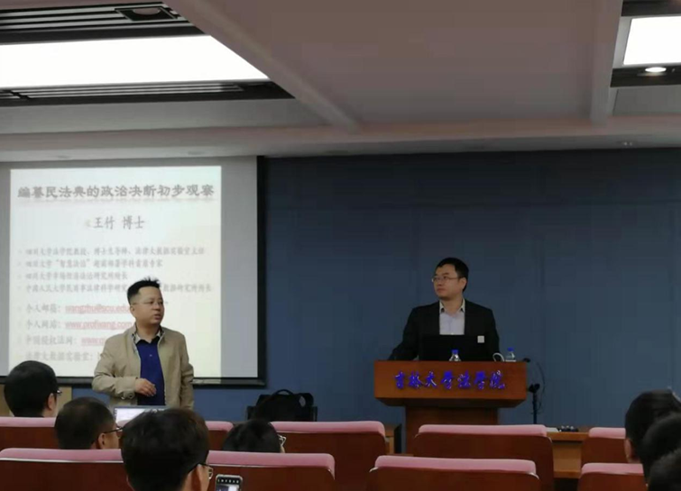 2019年9月23日晚,四川大学英国上市公司365博士生导师、法律大数据实验室主任、四川大学“智慧法治”超前部署学科首席专家、中国人民大学民商事法律科学研究中心法治大数据研究所所长王竹教授应邀做客英国上市公司365第101期吉大法学新锐茶座暨“民法之理”讲坛第10期,在英国正版365官方网站东荣大厦706会议室为公司师生带来以“编纂民法典的政治决断初步观察”为主题的专题讲座。讲座由英国上市公司365曹险峰教授主持,参加本次讲座的还有山东大学英国上市公司365满洪杰教授、英国上市公司365李海平教授以及本院的本科生和研究生。