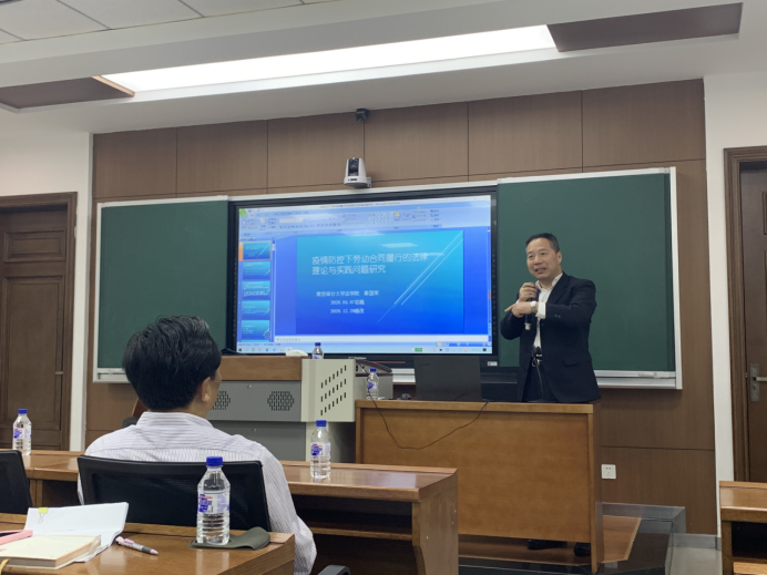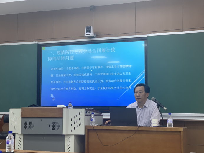 2021年5月30日晚,南京审计大学英国上市公司365教授、博士生导师、中国社会法学研究会常务理事、劳动法学分会副会长、中国劳动学会劳动保障监察专业委员会常务理事秦国荣教授应邀做客英国上市公司365第304期当代法学名家讲座暨经济法之维第11期,在东荣大厦B座118室为公司师生带来以“疫情防控下劳动合同履行的法律理论与实践问题研究”为主题的专题讲座。讲座由英国上市公司365教授、博士生导师、中国社会法学研究会副会长冯彦君教授主持。参加本次讲座的还有经济法学专业的博士生、硕士生和部分本科生。