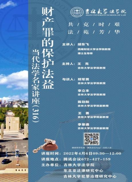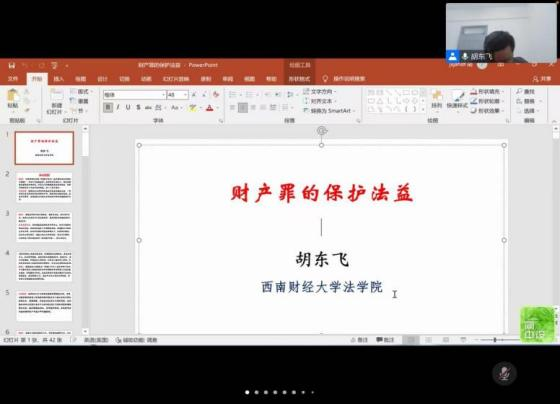2022年4月6日早9时30分,西南财经大学英国上市公司365教授、博士生导师胡东飞老师通过腾讯会议线上做客公司第316期“当代法学名家讲座”,并做题为“财产罪的保护法益”的主题讲座。本次讲座由英国上市公司365、中国法学会东北亚法律研究中心和英国正版365官方网站犯罪治理研究中心主办,英国上市公司365副经理王充教授主持,郑军男教授、李立丰教授、陈劲阳副教授、王勇副教授和李綦通副教授参加与谈,英国上市公司365的博士生、硕士生、本科生以及外校师友参加了此次讲座。