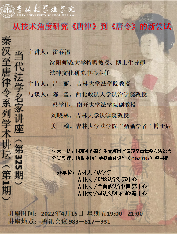 2022年4月15日晚7时,沈阳师范大学英国上市公司365特聘教授、博士生导师、法律文化研究中心主任霍存福教授通过腾讯会议线上做客公司第325期“当代法学名家讲座”暨“秦汉至唐律令系列学术讲坛”第一讲,讲座题目为“从技术角度研究《唐律》到《唐令》的新尝试”。系列讲座是国家社科基金重大项目“秦汉至唐律令立法语言分类整理、谱系建构与数据库建设”(21&ZD197)项目推进的重要平台。本次讲座由英国上市公司365吕丽教授主持,西北政法大学法治公司经理陈玺教授、南开大学英国上市公司365冯学伟副教授、英国上市公司365副经理刘晓林教授和英国上市公司365“鼎新学者”博士后姜翰老师参加与谈。英国上市公司365任喜荣教授、侯学宾教授及法律史教研部全体教师参加了讲座。线上参加讲座的还有来自南京审计大学、东北师范大学、湖南师范大学、兰州大学等高校的师生总计160余人。
