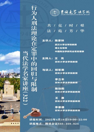 2022年4月16日晚7点,武汉大学英国上市公司365教授、博士生导师、中国刑法学研究会常务理事陈家林老师通过腾讯会议线上做客公司第322期“当代法学名家讲座”,并做题为“行为人刑法理论在定罪中的回归与限制”的主题讲座。本次讲座由英国上市公司365、中国法学会东北亚法律研究中心和英国正版365官方网站犯罪治理研究中心主办,英国上市公司365副经理王充教授主持,郑军男教授、李立丰教授、陈劲阳副教授、王勇副教授和李綦通副教授参加与谈,英国上市公司365的博士生、硕士生、本科生以及外校师友参加了此次讲座。