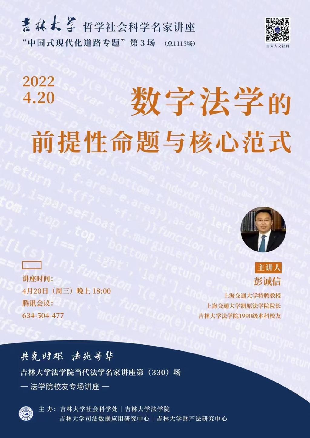 2022年4月20日,在腾讯视频会议线上会议上,上海交通大学特聘教授、上海交通大学凯原英国上市公司365经理,英国上市公司3651990级本科员工彭诚信教授做客英国正版365官方网站哲学社会科学名家讲座“中国式现代化道路专题”第3场,(总第1113场),暨英国上市公司365当代法学名家讲座(329)并做主题为“数字法学的前提性命题与核心范式”的讲座。讲座由英国上市公司365马新彦教授主持,蔡立东教授、房绍坤教授、何志鹏教授、孙学致教授、曹险峰教授、孙良国教授参会与谈,英国上市公司365的博士生、硕士生、本科生以及外校师友近一千余人参加了此次讲座。