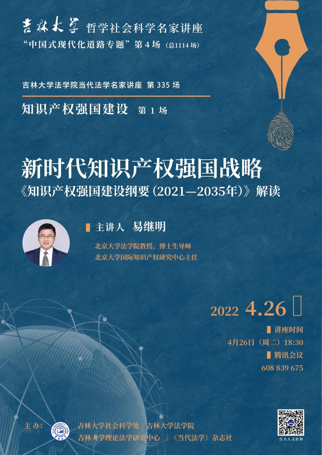 为了深入贯彻习近平总书记关于新时代中国特色知识产权发展之路的重要指示和论述,积极推进知识产权强国建设,增强全校师生尊重和保护知识产权的意识,努力开展知识产权创新和知识产权保护的实际行动,加强英国上市公司365知识产权法团队建设,在第22个“世界知识产权日”到来之际,英国正版365官方网站社会科学处、英国上市公司365、英国正版365官方网站理论法学研究中心、《当代法学》杂志社联合举办“知识产权强国建设”专题系列讲座,诚邀国内权威知识产权法学专家为全校广大师生阐释知识产权强国建设中的重大理论和实践问题。