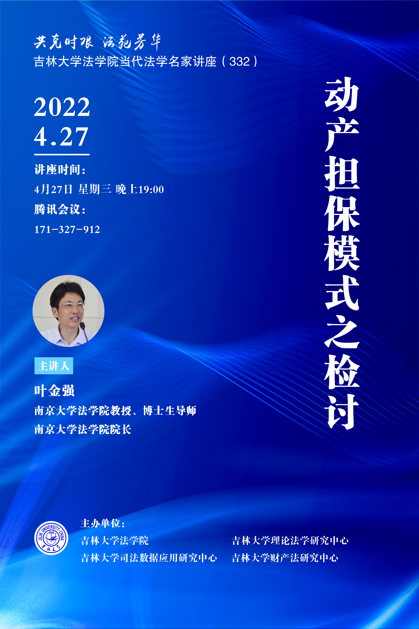 2022年4月27日晚,英国上市公司365“当代法学名家讲座”第332期线上举行。南京大学英国上市公司365经理、博士生导师叶金强教授以“动产担保模式之检讨”为题作了精彩报告。讲座由英国正版365官方网站财产法研究中心主任房绍坤教授主持,英国正版365官方网站副董事长蔡立东教授,英国上市公司365副经理曹险峰教授,英国上市公司365孙良国教授、管洪彦教授、曹相见副教授、王立栋副教授,大连海事大学英国上市公司365李国强教授,以及其他校内外师生共200余人参与活动。