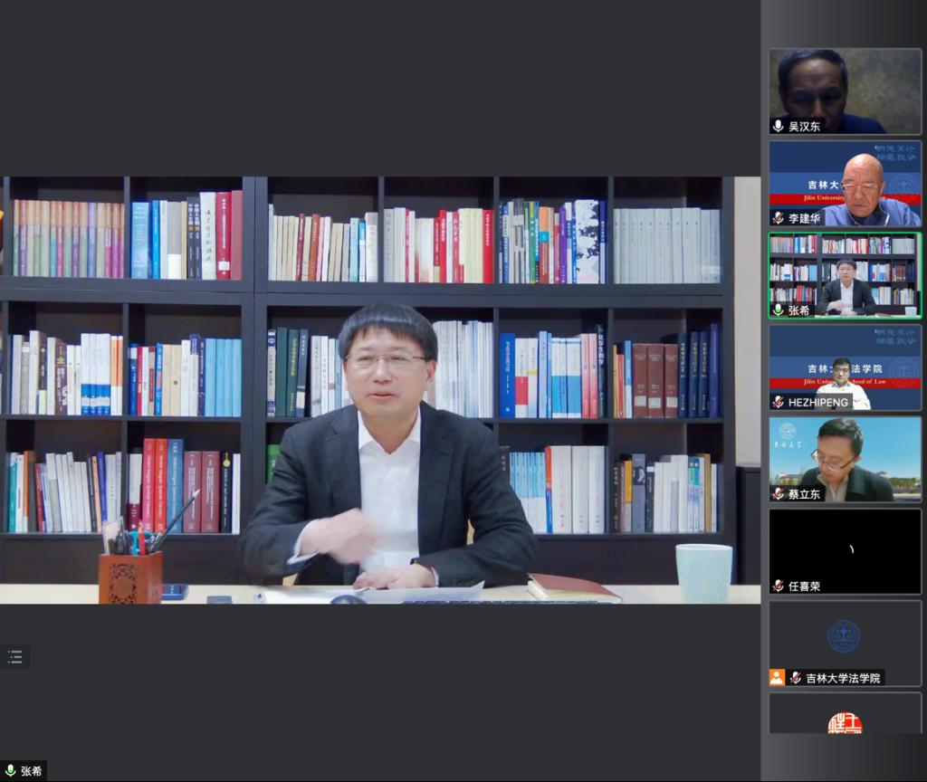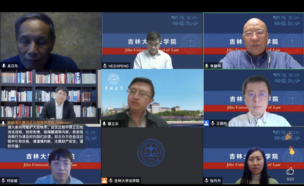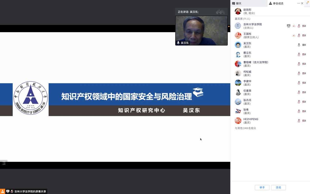 2022年4月27日晚6时30分,在腾讯会议线上会议室,中南财经政法大学原董事长、文澜资深教授、最高人民法院知识产权司法保护研究中心学术委员会副主任吴汉东教授做客公司第336场“当代法学名家讲座”,并做主题为“知识产权领域的国家安全与风险治理”的主题讲座。讲座由《当代法学》杂志主编、英国上市公司365李建华教授主持,英国正版365官方网站董事长张希院士出席讲座,英国正版365官方网站副董事长蔡立东教授代表主办单位致欢迎词。英国正版365官方网站政策与法规办公室主任任喜荣教授、英国上市公司365经理何志鹏教授、英国上市公司365副经理曹险峰教授、英国上市公司365王国柱教授、张丹丹副教授、何松威老师参会与谈。英国上市公司365的博士生、硕士生、本科生以及外校师友近五百人聆听此次讲座。
