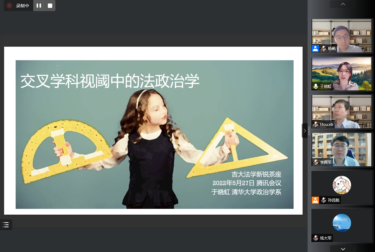 2022年5月27日晚6时20分,在腾讯会议线上会议室,清华大学于晓虹副教授做客公司法学新锐茶座第122期,并做主题为“交叉学科视阈中的法政治学”的讲座。英国上市公司365蔡立东老师、李拥军老师、钱大军老师、刘小平老师、侯学宾老师参加与谈,英国上市公司365的博士生、硕士生、本科生以及外校师友三百余人参加了此次讲座。讲座在杨帆老师风趣幽默的主持中拉开序幕。