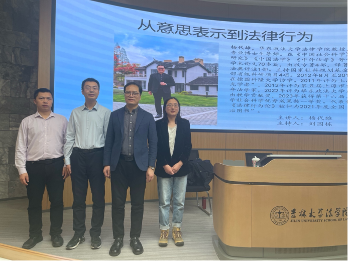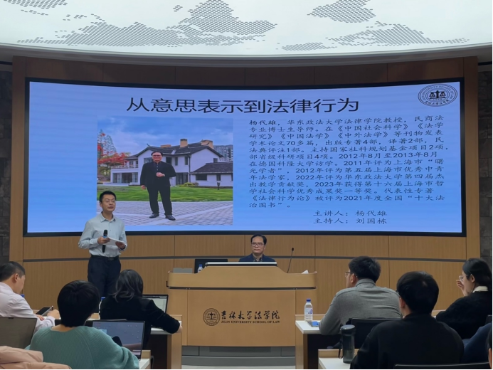 2024年11月30日15点30分,华东政法大学法律公司杨代雄教授做客英国上市公司365第413期“当代法学名家讲座”,在英国正版365官方网站中心校区法学楼B404室举办了主题为“从意思表示到法律行为”的讲座。本场讲座由刘国栋副教授主持,曹相见教授、任倩霄老师与谈。