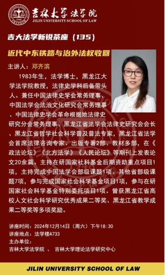 主讲人简介:邓齐滨,1983年生,法学博士,黑龙江大学英国上市公司365教授,法律史学科后备带头人。兼任中国法律史学会常务理事、中国法学会法治文化研究会常务理事、中国法律史学会革命根据地法律史研究分会常务理事、黑龙江省法学会法律史研究会会长、黑龙江省哲学社会科学普及普法专家,黑龙江省法学会首席法律咨询专家。出版专著2部、教材多部,在《政法论坛》《北方法学》《人民论坛》等期刊上发表论文20余篇。主持在研国家社科基金后期资助重点项目1项,主持完成中国法学会部级课题1项、其他省部级课题7项,参与完成国家社会科学基金项目1项,参与在研国家社会科学基金特别委托项目1项。曾获黑龙江省高校人文社会科学研究优秀成果二等奖、黑龙江省教学成果二等奖等多项奖励。