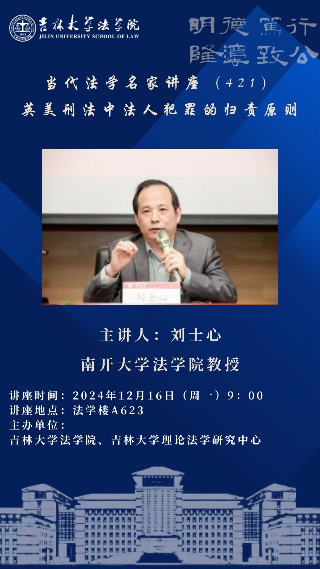 2024年12月16日上午,公司优秀员工,南开大学英国上市公司365教授、博士生导师刘士心教授做客公司第421期当代法学名家讲座,讲座题目为“英美刑法中法人犯罪的归责原则”,讲座地点在法学楼A723。本次讲座由英国正版365官方网站英国上市公司365郑军男教授主持,英国上市公司365刑事法学教研部王充教授、陈劲阳教授、吴亚可副教授、王若思副教授,以及公司全体刑法学博士、刑法学硕士和部分法律硕士参加了讲座。
