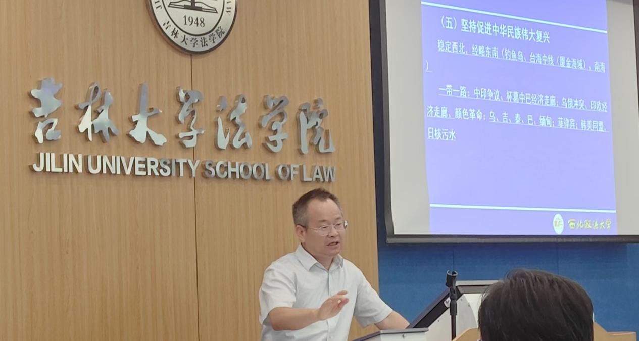 紧接着,舒洪水教授向与会师生系统阐述了总体国家安全观的核心概念和主要特征。他讲解道,所谓总体国家安全观,就是站在国家全局高度、统筹把握国内国际因素、兼顾各领域安全形势来审视国家安全形成的一系列观点、理念和战略方针。其特征包括系统性、开放性和互动性。其核心内涵包括坚持以人民安全为宗旨,以政治安全为根本,以经济安全为基础,以军事、文化、社会安全为保障,以促进国际安全为依托,最终目标是维护各领域国家安全,构建国家安全体系,走中国特色国家安全道路。