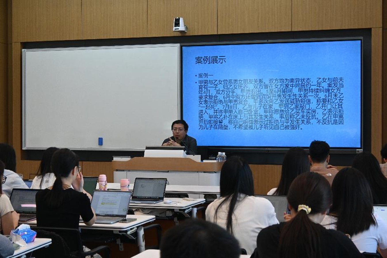 理论讲解结束后,孙泽龙检察官再次聚焦课程开篇的三个案例,引导同学们运用所学知识展开讨论。“乙女的‘不反抗’是否等同于‘自愿’?”“调班胁迫能否认定为性犯罪中的‘胁迫’?”“与未满14周岁未成年人发生关系,加重情节的适用是否应区别于普通强奸?”同学们围绕这些问题各抒己见,结合理论知识与朴素正义观表达观点。孙检察官耐心倾听每一位同学的发言,对合理观点给予肯定,对存在偏差的认知及时纠正,通过“案例复盘—理论应用—观点碰撞”的模式,帮助同学们深化对性犯罪认定标准的理解。