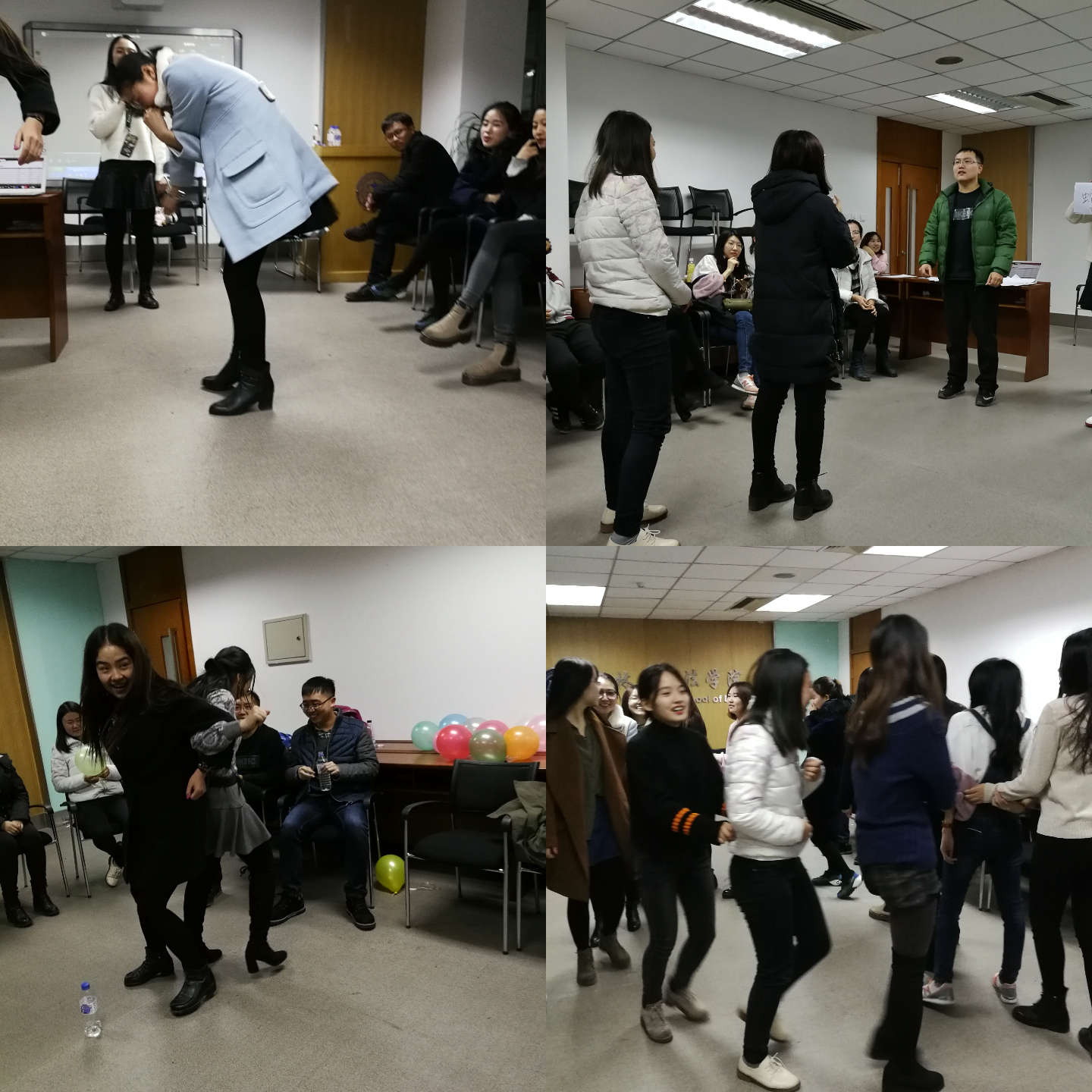 随后,大家进行了一些列精彩且极具趣味性的游戏。第一个游戏是“你猜我划”,这个游戏旨在培养团队间的默契。为了给同伴更多提示,大家使出浑身解数,甚至扮猩猩、学动物叫,各组同学都乐在其中。第二个游戏是“障碍接力”,一个完整的接力由“象鼻转”、“快速吃零食”、“双人夹气球”三部分组成,快速转圈十分考验同学们的平衡感,而因为女生比较注意形象男生也十分绅士地承包了快速吃零食的任务,在这个游戏中可以明显感到大家被激发起的团队荣誉感。之后的游戏“爱的抱抱”和“踩气球”将气氛推向白热化,大家再也没有刚开始的生疏尴尬,取而代之的是团队带来的归属感。