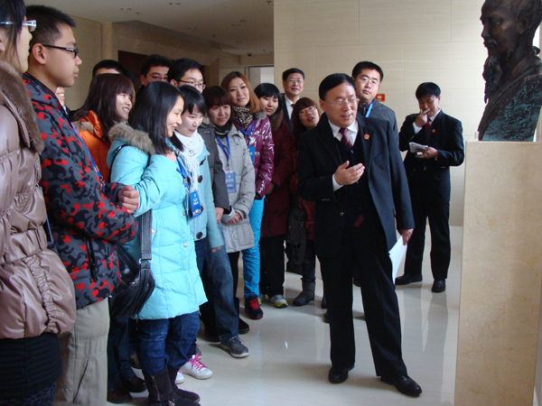 张文显经理亲切的和大家说明了情况,原来是省高级人民法院新建的审判大楼设置了法律文化长廊,在数不清的古今中外的法学家中共精心挑选了21位最有代表性著名法律人物的雕像,分三层摆放展示,他正是要对为何偏偏选出这21位法学家进行一个讲解。说着,张文显经理引导人们来到了一楼大厅法律文化长廊的马克思、列宁、毛泽东、董必武的铜塑雕像前。其中,他特别强调了将董必武列入21位法学家之中的原因,他说:“董必武是党的创始人和第一代领导人,也是其中唯一系统学过法律的,他在日本留学时学的就是法学,当时在武汉,曾是著名的大律师。建国以后,是第一任最高人民法院经理。董老的法治思想对现在和今后我国的法治建设仍有重要的指导意义。”